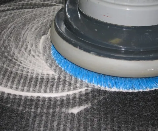 - Далее производится механическая обработка ковролина с помощью дисковой щеточно ротационной машины (полотёра), на щетку которой подаётся моющий состав с последующим вспениванием и поднятием ворса ковролина, вследствии чего грязь от поверхности ковра переходит во взвешенное состояние моющего состава.